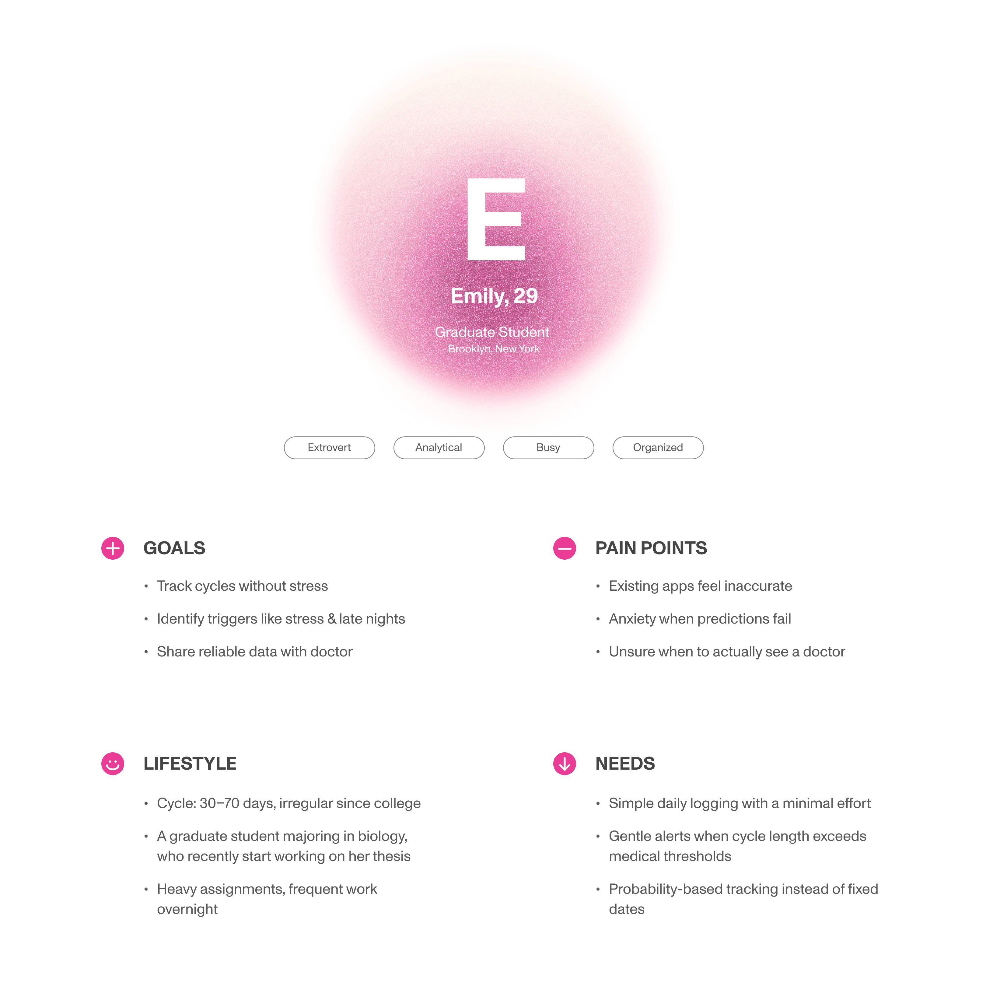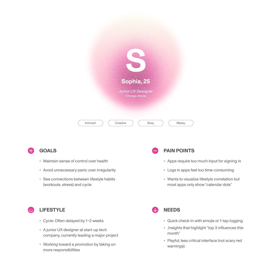 With the visualized graphic elements, the user easily check their cycle prediction and how much their daily routine are synchronized with their menstruation.