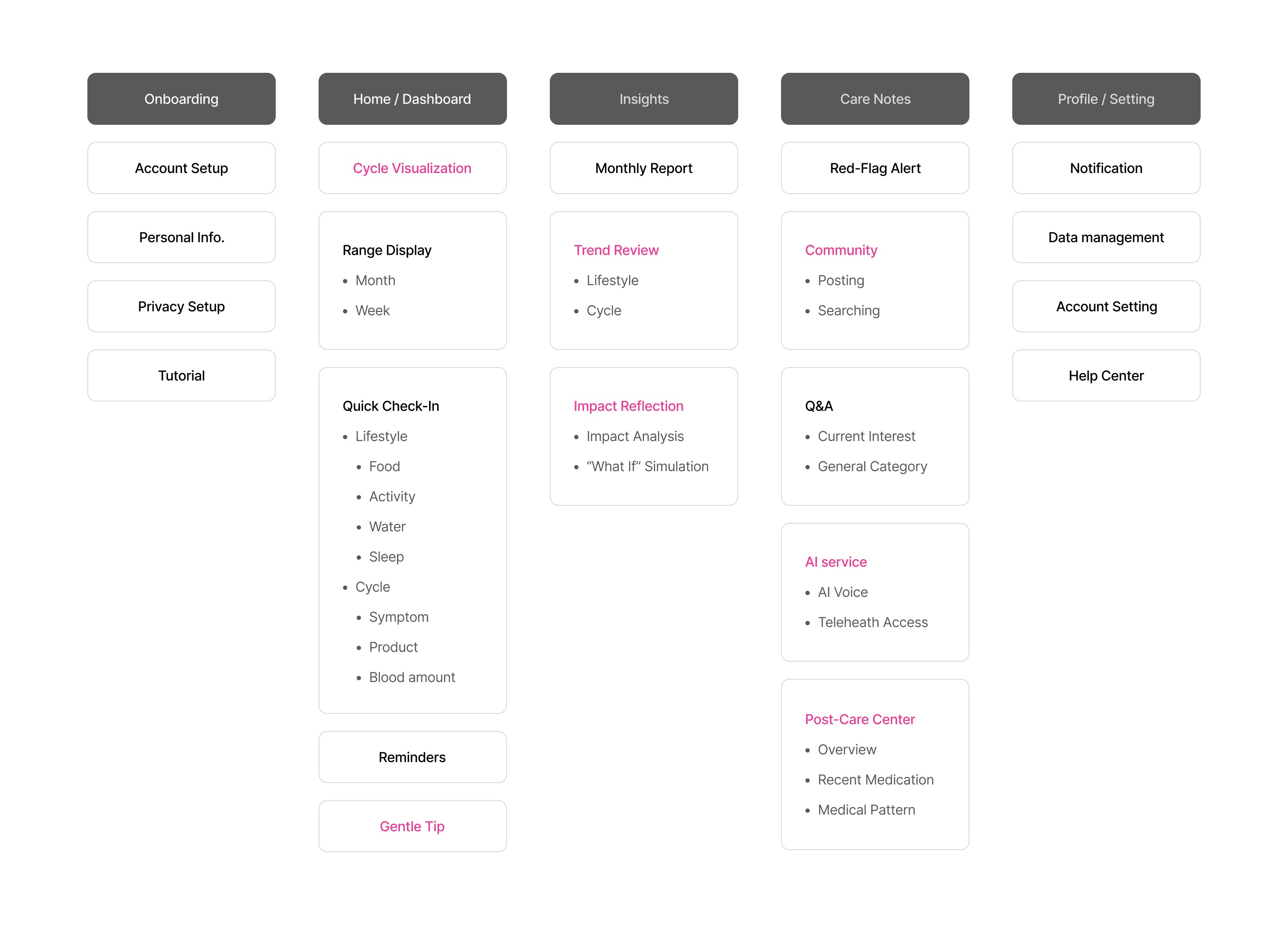 The lifestyle pattern insights are driven according to the user's personal recoding. This feature presents how their daily routine are directly impact on the menstruation and suggest how to improve their everyday life for the better, regular menstruation.