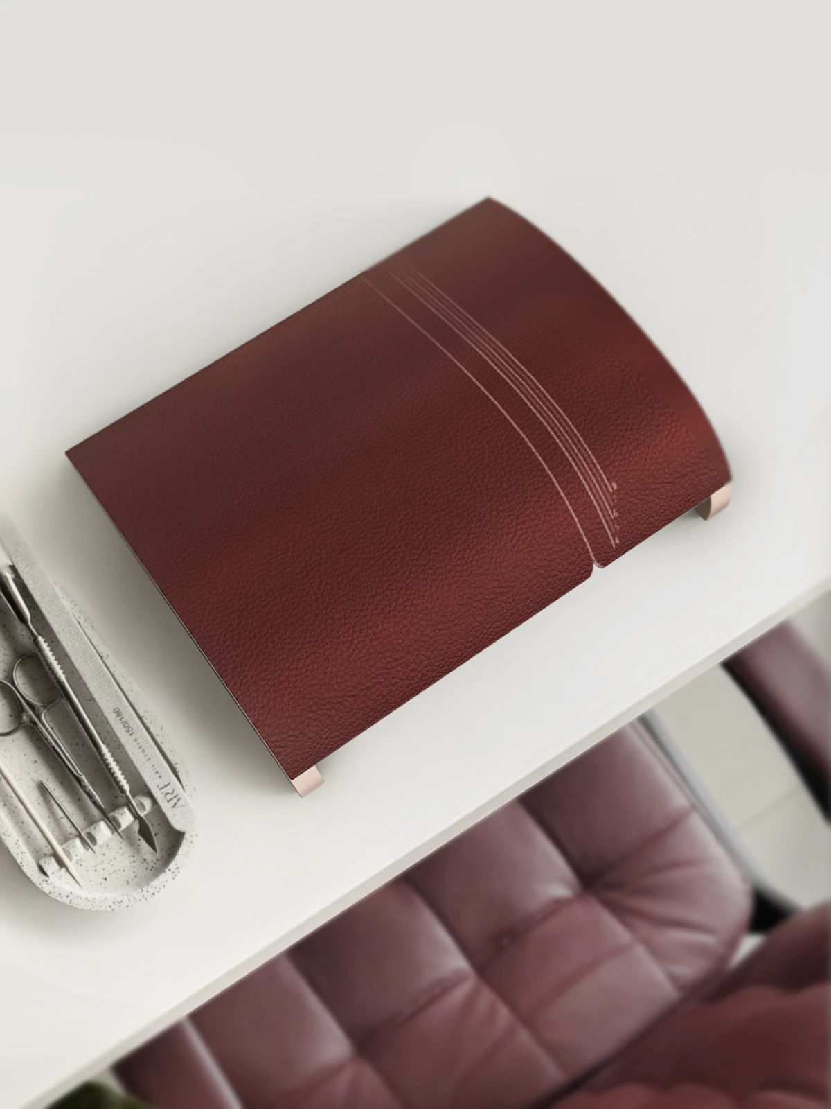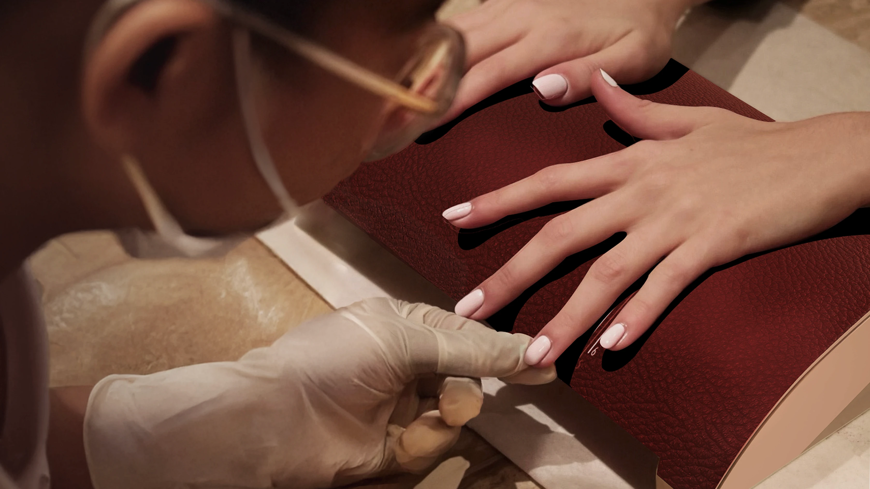 A manicure hand rest featuring a patterned ring-size unit that lets manicurists discreetly measure a client’s ring size while providing nail care.